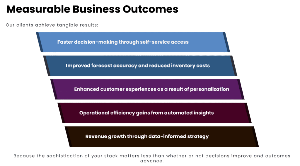 From strategy consulting to hands-on implementation, we help organizations build sustainable analytics ecosystems that drive long-term, data-driven decision-making.