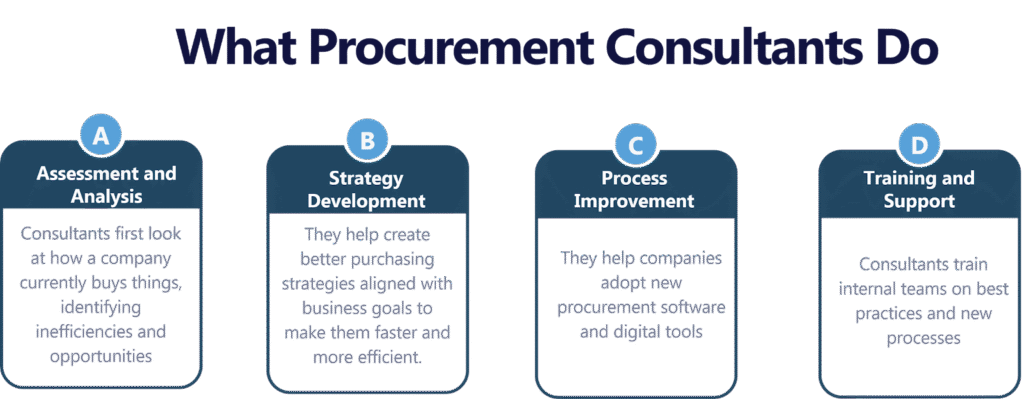 Procurement consultants act as expert advisors who bring industry knowledge, cross-sector experience, and analytical expertise. They assess procurement structures, identify inefficiencies, and design transformation strategies tailored to business goals.