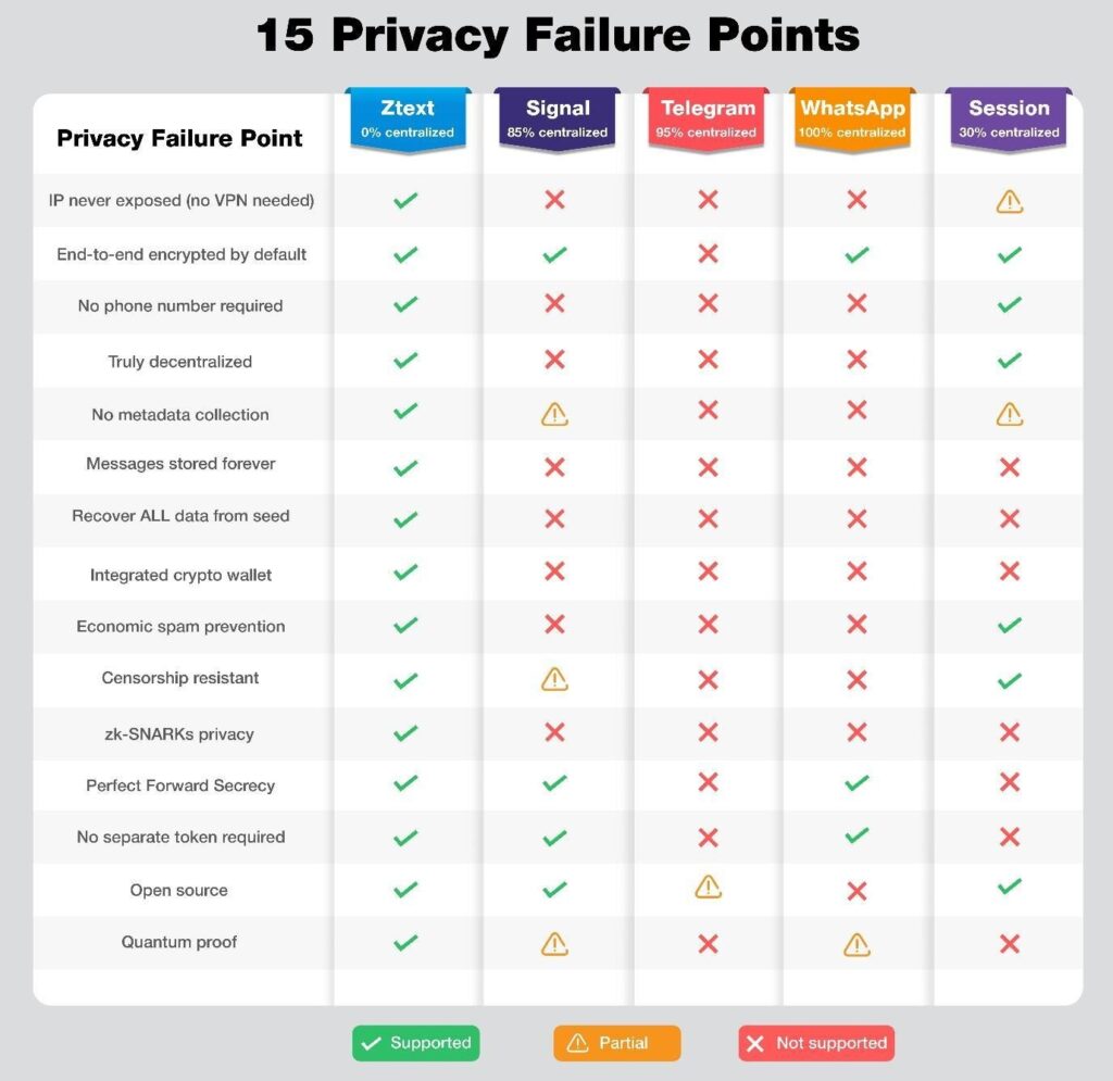 The team behind Z-text did something refreshing: they actually measured the competition. They identified 15 critical privacy failure points and 10 points of centralization across the biggest messengers.